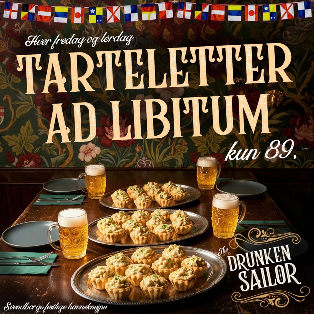 The Drunken Sailor er også den skønneste tarteletbar! Hver eneste fredag og lørdag serverer vi tarteletter i stride strømme. Du får tarteletter ad libitum for kun 89 kr pr person når du forudbestiller senest dagen forinden. 149 kr hvis du bestiller i baren.